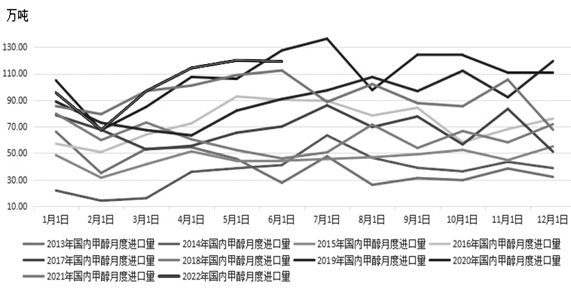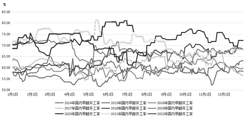 每年3—5月為國內甲醇裝置春季檢修期,今年也不例外。不過,對比往年同期的開工水平,今年的檢修規模相對縮小,且部分項目檢修時間推遲,以至于今年1—6月甲醇產量同比增加。據統計,今年6月國內甲醇產量為693.82萬噸,環比減少11.87萬噸,但1—6月產量為3543.37萬噸,同比增加64萬噸,增幅為1.85%。另外,截至7月15日當周,平均開工率為76.06%,雖環比回落2.77個百分點,但同比提升1.24個百分點,且較過去8年的平均值高出12.13個百分點,表明國內甲醇供應壓力增大。
