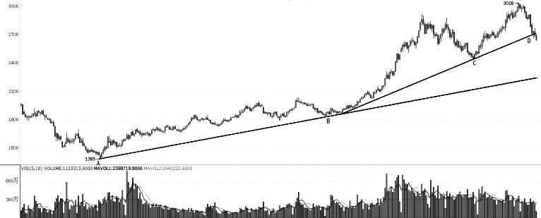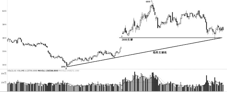 豆粕A點至B點的上漲以2月8日的跳高缺口為標志,分為兩個上行階段,缺口上沿在3600元/噸,下沿在3400元/噸。高點至今的回落也存在兩個重要的下跌位置。其中,第二輪下跌目標就是3600元/噸缺口位置,同時測試下方最重要的趨勢支撐。這兩個技術支撐是引發近期豆粕止跌反彈的重要原因。展望后市,第一種情況是3600元/噸支撐繼續產生效力,從而引發更大幅度的反彈;第二種情況是進一步趨弱,最終下破3600元/噸,達到理論目標3400元/噸支撐,這種可能性更大。(開元貿易 顧敏忠)