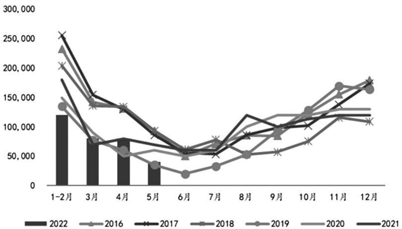 海關總署數據顯示,2022年1—5月蘋果累計出口量為320萬噸,為近五年同期較低值。從下半年預期來看,高價對于需求的抑制影響仍然存在,同時又有全球經濟不確定性因素的影響,蘋果出口端增長仍顯乏力。