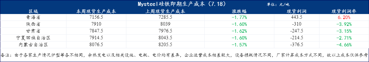 進入7月開始,硅鐵現貨價格逐步跌破成本線,主產區廠家開始減產檢修,尤其是寧夏區域,進入7月寧夏中衛區域廠家陸續減產,截至至7月18日,寧夏中衛區域僅剩10臺硅鐵礦熱爐在生產,其中一臺可能于今天或者明天停產,寧夏三元后續可能進行電路整改全停至月底,加上三元的產量,預計寧夏區域硅鐵日產將會降至1450噸/天,較上月同期硅鐵日產量在4390噸,下跌幅度66.97%。