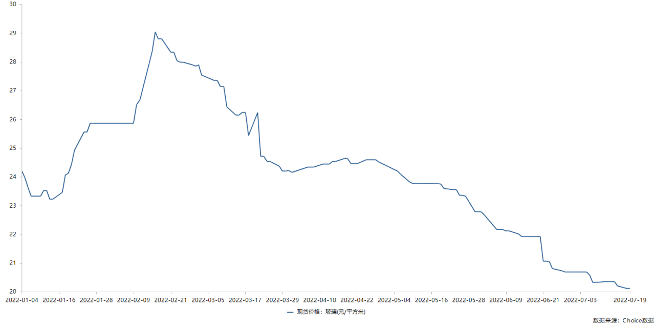 據顯示,截至7月19日玻璃現貨價格為20.12元/平方米,前一月份的玻璃現貨價格為21.92元/平方米,一個月累計跌超8%。如圖1所示: