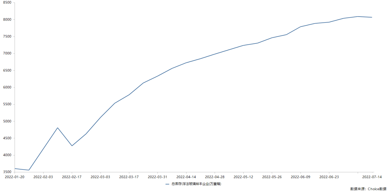 截止到2022年07月14日,全國浮法玻璃樣本企業總庫存8063.8萬重箱,環比跌0.30%,同比漲297.62%。玻璃庫存仍處于高位。如下圖2所示: