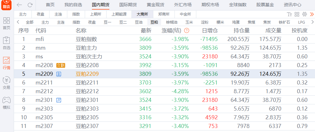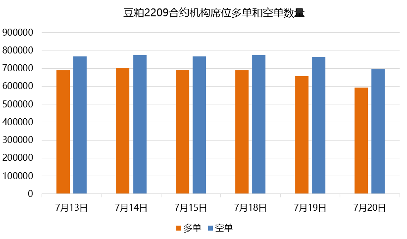 豆粕2209合約,凈持倉數量排名前三席位的凈多單量明顯小于凈空單量,其中國信期貨席位下的凈空單量比較突出。