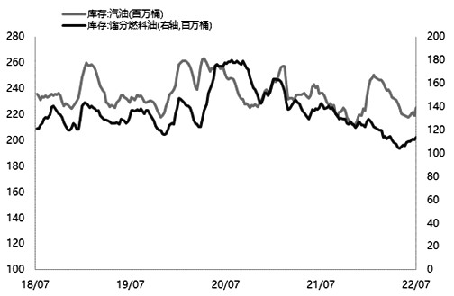 成品油需求支撐逐步減弱,庫存累積趨勢明顯。國際油價上漲和全球經濟環境不佳已經開始對石油需求造成損害,全球發達經濟體石油需求增長放緩。7月,原油三大機構公布的月報顯示,OPEC沒有調整需求預期,但國際能源署(IEA)和美國能源信息管理局(EIA)均進一步下調原油需求。以EIA發布的報告為例,EIA認為,高油價將導致美國7—10月的汽油消費量低于先前預期。7月,汽油日需求量將達到907萬桶,比6月的預測下降2.2%。EIA對今年全球原油的增長預測也因全球經濟衰退預期而下調,目前預計原油需求每天增加220萬桶,年初時的預估為每天增加360萬桶。總體來看,成品油需求恢復仍不及疫情前水平,并且第三季度消費量也不及預期,對原油的需求支撐隨之減弱。