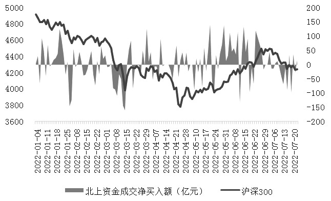 7月以來,A股市場波動加大。一方面,在經過5月至6月的反彈后,市場對國內經濟企穩復蘇和政策穩增長已經有一定的預期,進一步上漲需要基本面、政策面等方面更加明確的信號和支撐。目前國內疫情得到有效控制、經濟逐漸企穩復蘇,海外美聯儲緊縮壓力仍存,使得貨幣進一步寬松的概率降低。此外,近期國內局部地區疫情有所反彈以及房地產領域相關問題也給市場風險偏好造成擾動,使得部分資金出現獲利了結現象。另一方面,自6月議息會議后,海外市場衰退擔憂明顯升溫,大宗商品價格大跌,2年期美債利率與10年期美債利率倒掛程度加深。美國6月CPI同比增長9.1%再超市場預期,市場開始預期7月議息會議可能加息100BP。在海外衰退擔憂升溫、通脹高企、緊縮壓力仍存的背景下,北上資金雙向波動現象較為頻繁,使得A股市場也受到一定影響。
