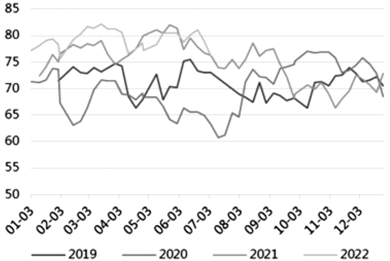 6月中旬以來,在甲醇價格下跌的同時煤炭價格相對穩定,煤制甲醇利潤由正轉負,且虧損程度加深。今年春檢強度不及往年,以至于上半年甲醇總體供應維持較高水平。2022年1—6月,國內累計生產精甲醇4412.95萬噸,較2021年同期增長3.84%。6月中旬起,盤面利潤大幅縮水,進而影響7月甲醇裝置開工率。數據顯示,7月14日當周,甲醇裝置周度開工率為76.06%,同比提升2.77個百分點,環比下滑3.64個百分點;周度產量為153.59萬噸,同比增長2.98%,環比下降3.73%。