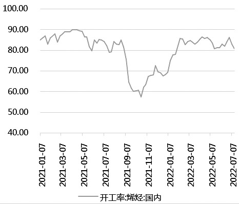 目前,制烯烴(MTO/MTP裝置)是甲醇下游消費的最大領域,占甲醇下游消費量的半數以上。2022年上半年,甲醇下游制烯烴裝置開工率較高,且檢修較少,對甲醇消費形成支撐。近期,開工率表現不如之前。7月14日當周,制烯烴裝置開工率為80.81%,環比下滑2.19個百分點。新增產能方面,6月,天津渤化產能180萬噸/年的甲醇制烯烴裝置試車成功,正常運行后一定程度上能夠提振沿海甲醇需求。