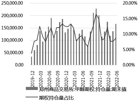 2019年12月上市至今,甲醇期權成交量逐步攀升,期權成交量占甲醇期貨市場成交量的比例也明顯提升。2022年上半年,甲醇期權累計成交超過1411萬手,同比增長79.48%。僅6月,就成交285.9萬手,同比增長141.31%。2022年上半年,甲醇期權成交量月均占比為8.42%,較2021年的4.72%抬升3.7個百分點。