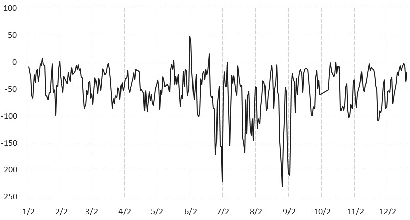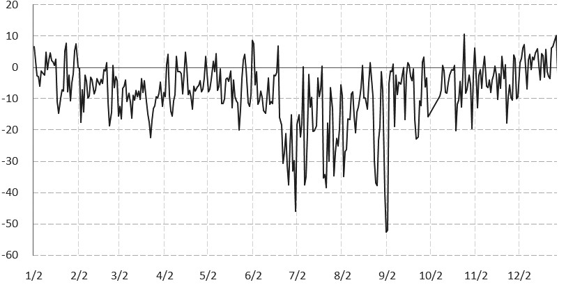 選取IF當月合約與IC當月合約,計算自股指期貨發行以來每日基差的均值(股指期貨發行以來,每年當日基差之和與歷年該日為交易日次數的比值)。數據顯示,5月至9月,基差波動明顯大于其他月份。