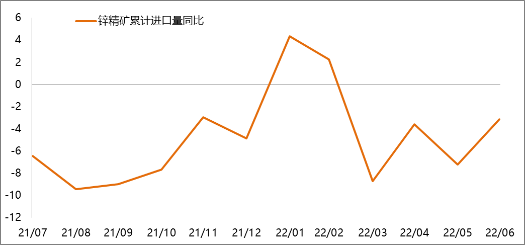 2022年6月鋅精礦進口29萬噸,環比+20%,同比+25%,2022年1-6月累計進口182萬噸,同比-3.12%。鋅礦供應仍相對偏緊。