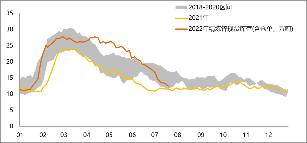 截止2022年7月22日精煉鋅社會庫存(含倉單)為12.49萬噸,較上周四-0.66萬噸。