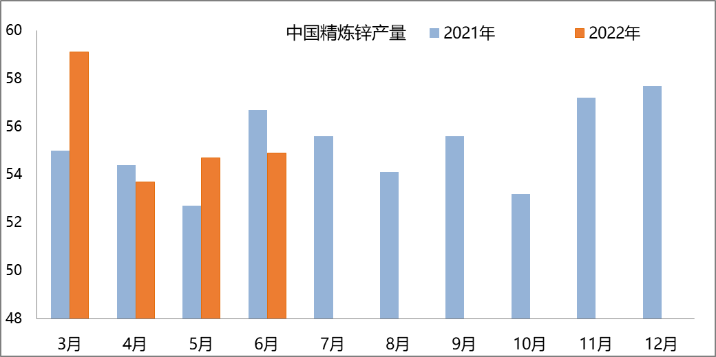 據國家統計局數據顯示,2022年6月精煉鋅產量54.9萬噸,環比-0.3%,同比-3%。7月仍有部分冶煉廠由于原料緊缺而被迫檢修。