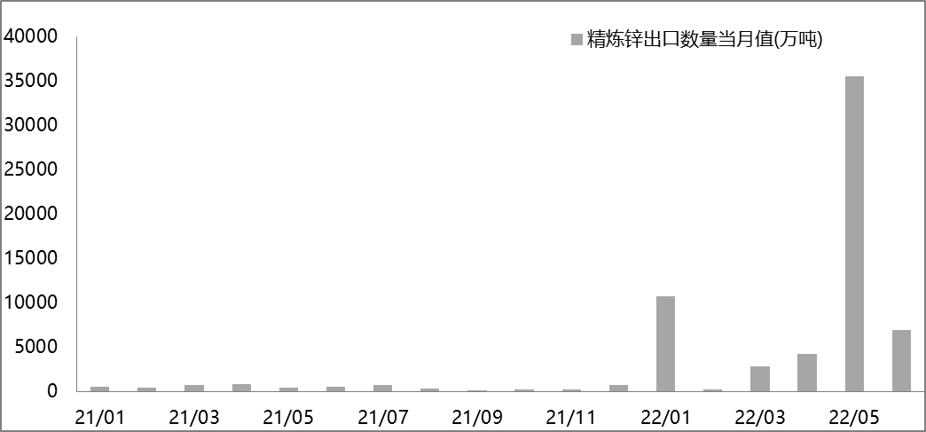 2022年6月精煉鋅出口6943噸,是去年同期的12倍,環比上月減少80%。