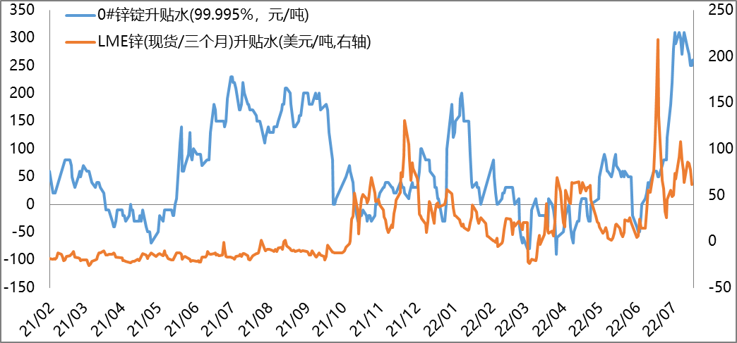 截止2022年7月22日,上海0#鋅錠現貨較期貨升水260元/噸,較上周-50元/噸;LME現貨較期貨升水61.25美元/噸,較上周-24.25美元/噸。