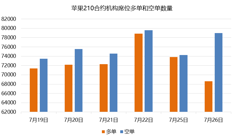 7月26日,210合約資金凈流出8832萬元,收于8703,跌幅達到2.29%。蘋果主力合約今日中陰回落,機構席位空單增加,多單減少,凈持倉差距拉大。