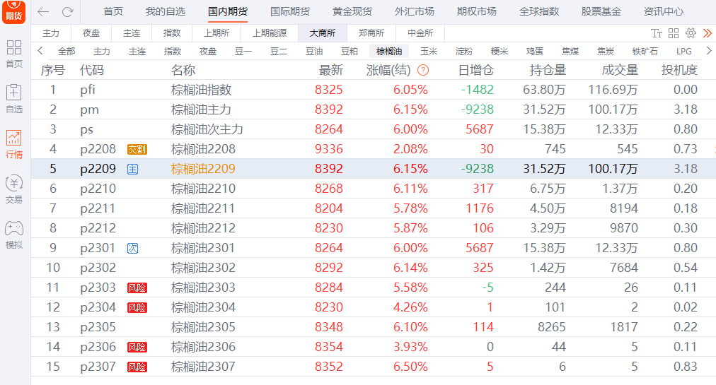 7月28日,棕櫚油2209合約資金2.17億元,收于8392,漲幅達到6.15%。美聯儲加息靴子落地,后續加息進度或會相對緩和,市場對經濟衰退的擔憂減弱,商品市場價格逐步回歸基本面,棕櫚油主力合約今日底部長陽反彈。