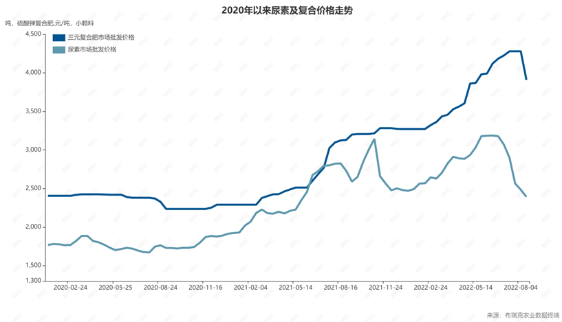 8月24日,據國家統計局數據,8月中旬,尿素價格為2340.9元/噸,復合肥價格為3910元/噸。6月中旬是今年的價格高點,分別為3177.7元/噸、4185元/噸。今年1月上旬,二者價格分別為2492.5元/噸、3272.5元/噸。